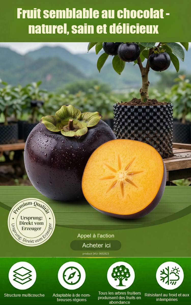 😋 Saveur Unique : Chair sucrée comme le miel, onctueuse avec un subtil arôme de chocolat. ❄️ Ultra-Rustique : Résiste au gel jusqu'à -15°C. Parfait pour toutes nos régions ! 🌳 Format Compact : Idéal en pleine terre ou en grand pot sur un balcon/terrasse. 🚀 Récolte Facile : Jusqu'à 50kg de fruits par an. Entretien minimal, même pour débutants. ✅ Sérénité Totale : Plant greffé de 2 ans. 🛡️ Garantie de reprise 100% remboursé.